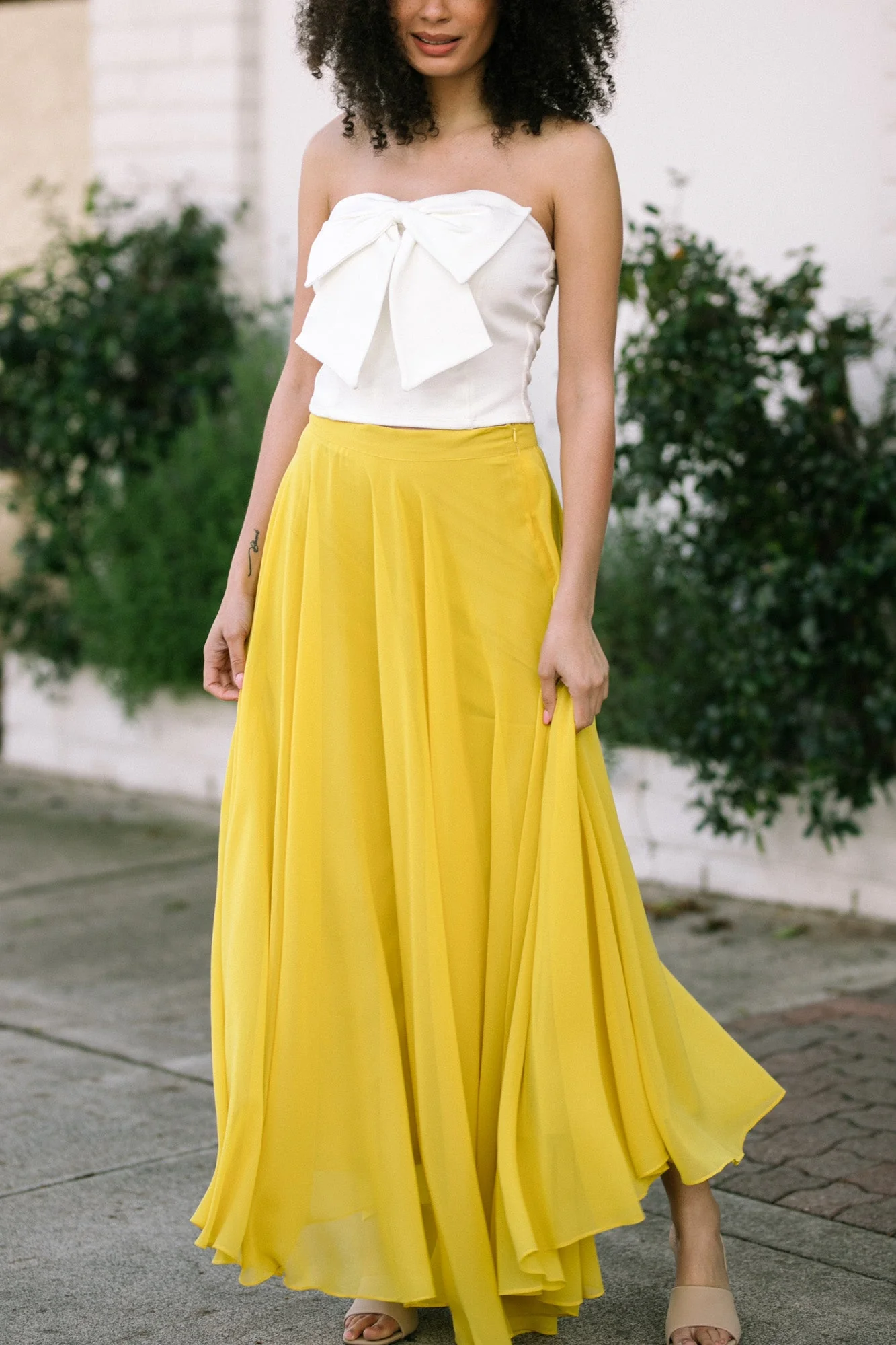 Featuring flowing layers and a flattering shape, this full maxi skirt exceeds expectations. Pair this stunning bright yellow maxi skirt with heels and a lace top for an ideal engagement shoot outfit, or dress it down with a casual camisole for a brunch with friends.