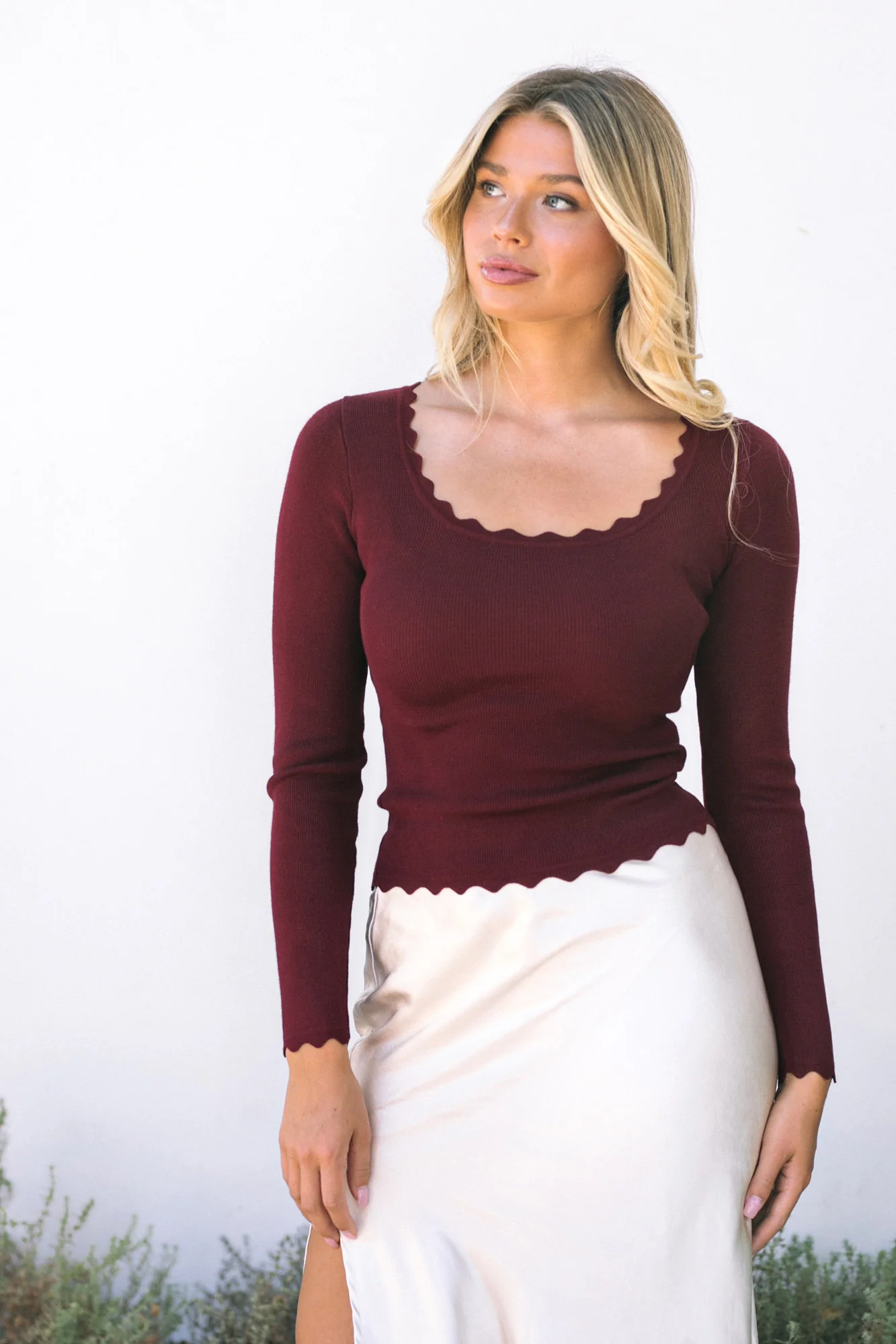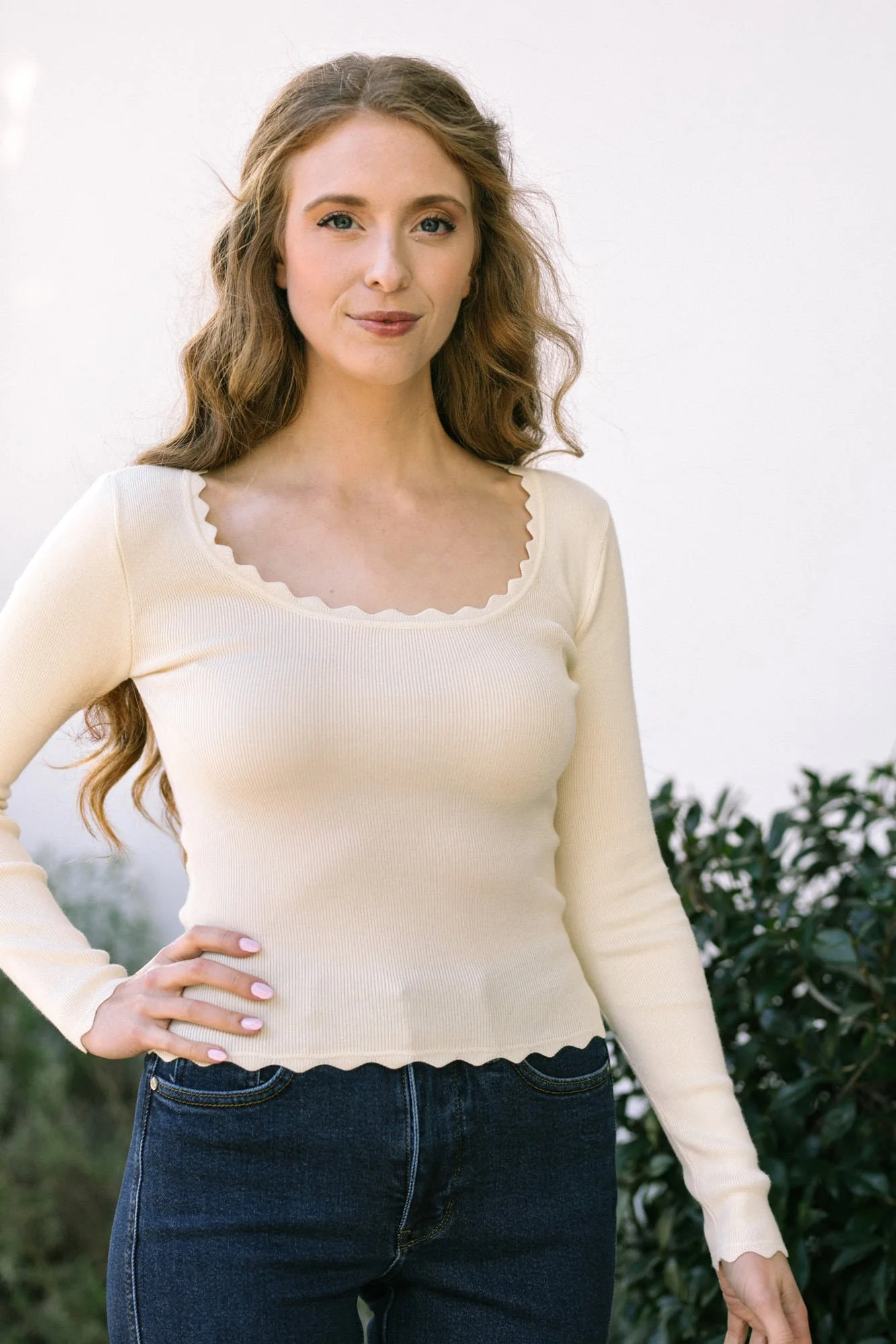 • Enhance your basic wardrobe with this scalloped long sleeve!