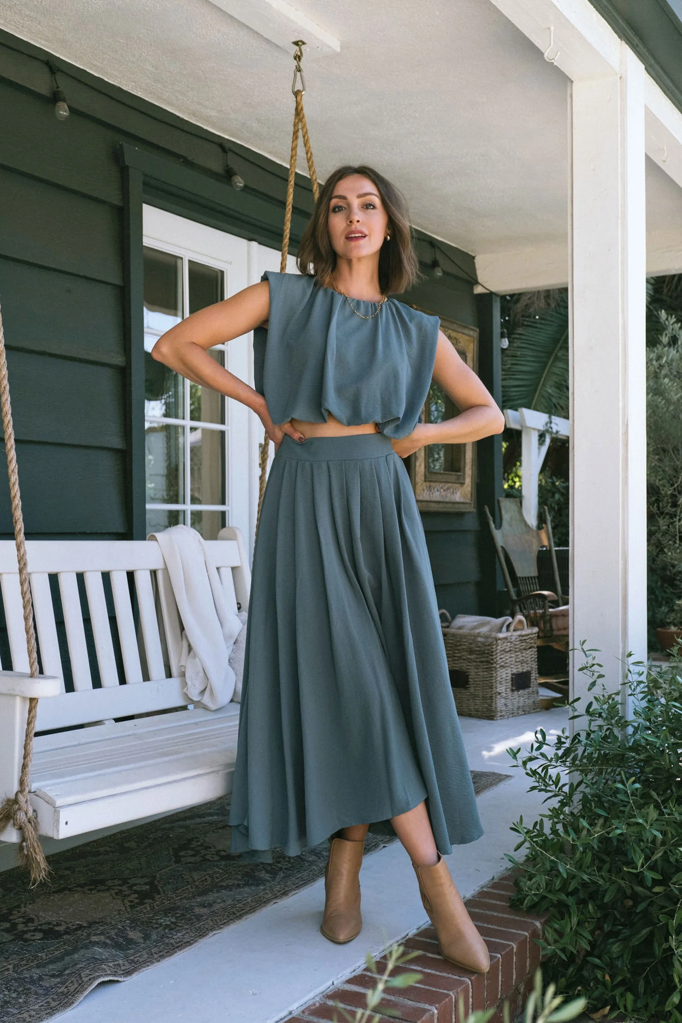 • A 5'6\" model is wearing a Small size (a muted blue - green color)